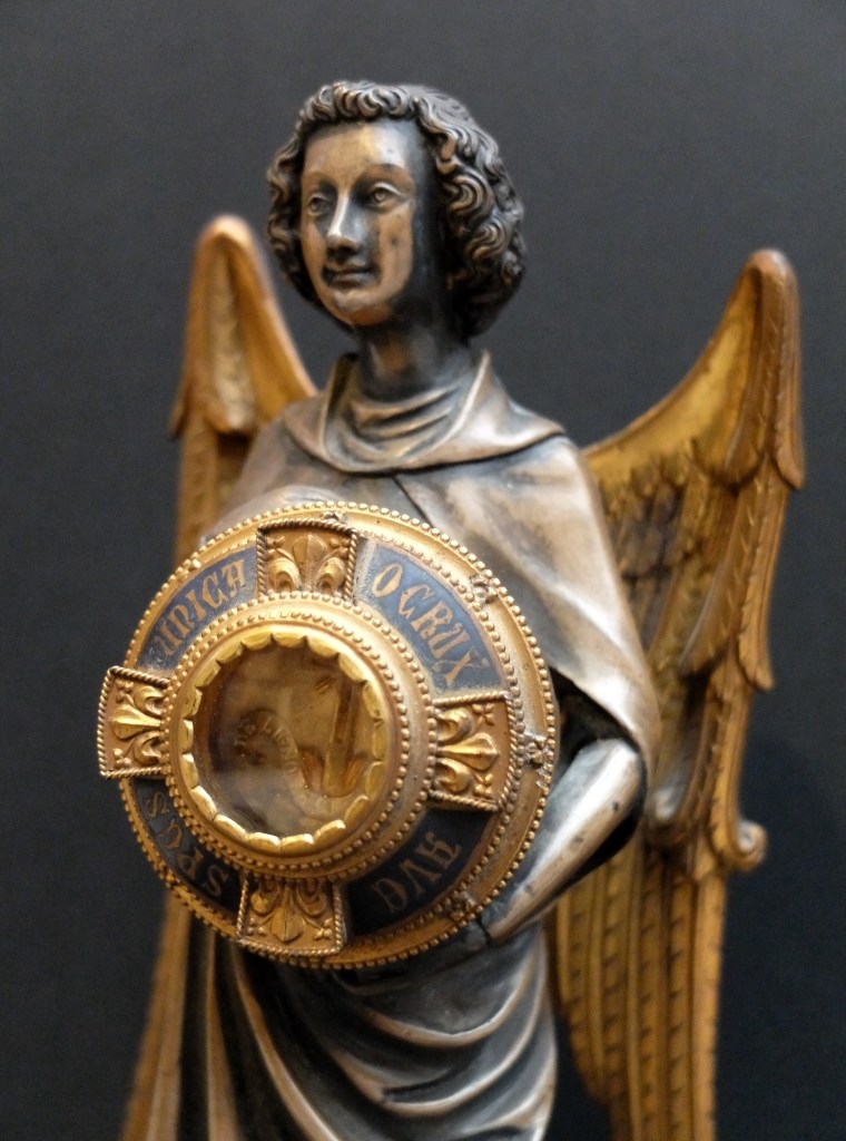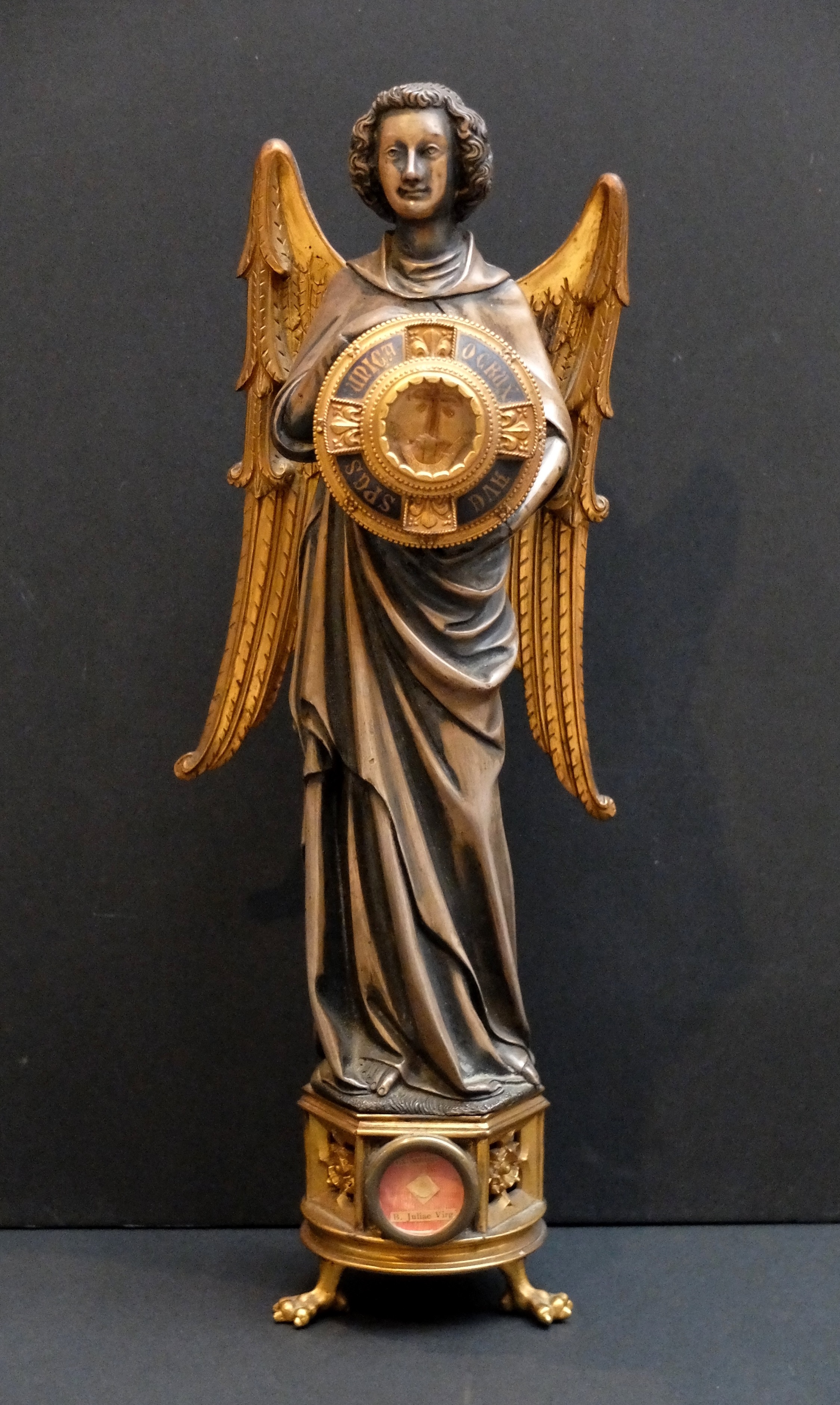 L’autre pièce majeure envoyée à Paris, le reliquaire de la Vraie Croix et de sainte Julie Billiart se présente sous la forme d’un ange en cuivre doré, tenant dans ses mains un médaillon vitré. Celui-ci contient une parcelle de la Vraie Croix, identifiée par l’inscription « De Ligno SS Crucis Domini ».