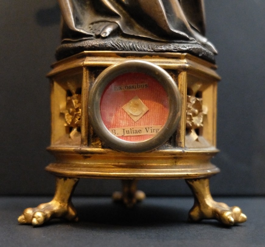 Dans son socle ajouré se trouve un second médaillon renfermant une relique de Julie Billiart (1751-1816), fondatrice des Sœurs de Notre-Dame de Namur, béatifiée en 1906 et canonisée en 1969. Cette double présence, marquée par les inscriptions latines « O Crux Ave Spes Unica » et « Ex ossibus B. Juliae Virg. », fait de ce reliquaire un témoin spirituel et historique majeur du 19e et du 20e siècle car sainte Julie Billiart a été béatifiée par Pie X le 13mai 1906, puis canonisée par Paul VI le 22 juin 1969.