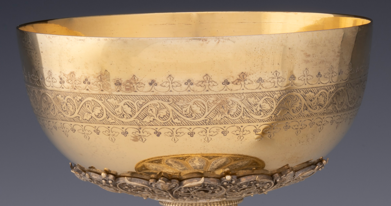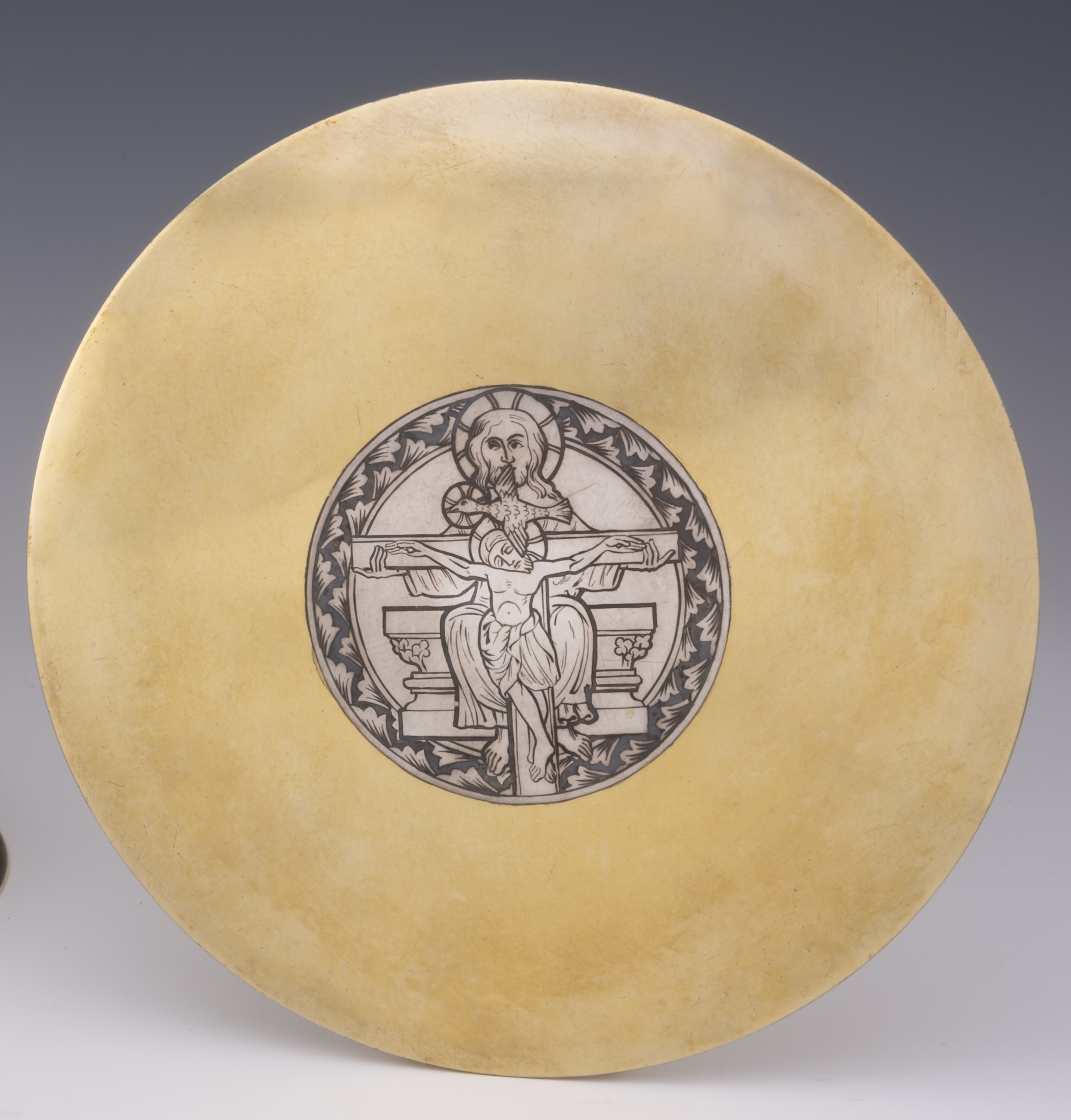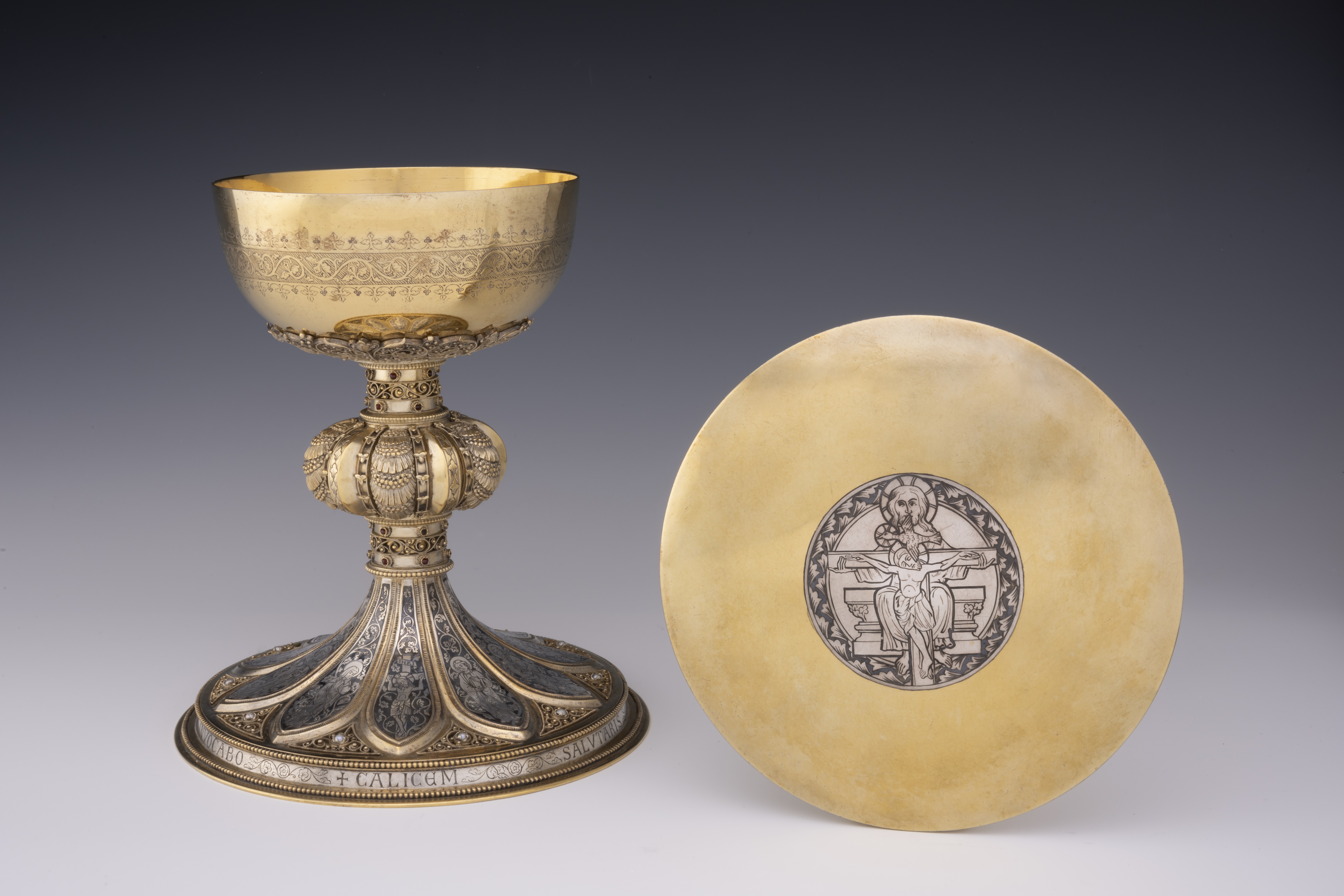 Réalisé en 1909 par l’orfèvre liégeois Joseph Wilmotte fils, le calice, accompagné de sa patène, s’inspire directement de la production d’Hugo d’Oignies (1178-1240). En argent doré et orné de fines décorations, il porte plusieurs inscriptions latines ainsi que de petites figures niellées représentant le Christ en croix, la Vierge, saint Jean, quatre évangélistes ; et toute une série d’autres apôtres et saints dont François et Alphonse, lesquels correspondent aux prénoms des arrière-grands-parents des donateurs·trice, François et Alphonsine.